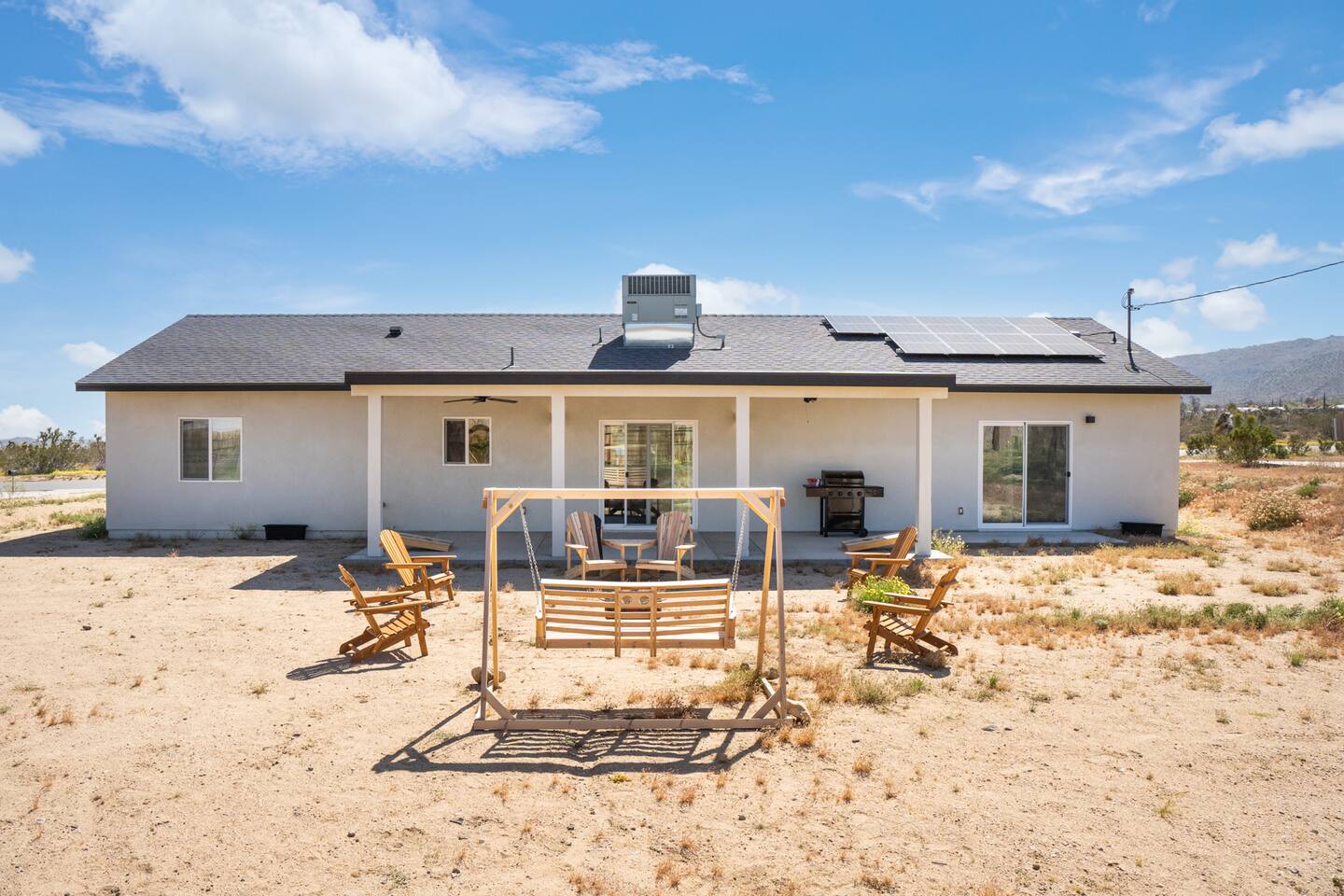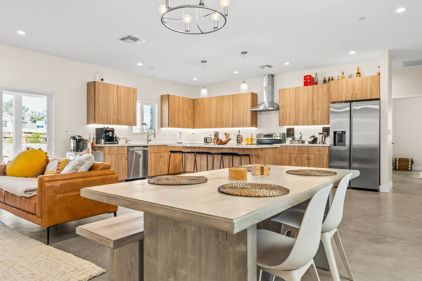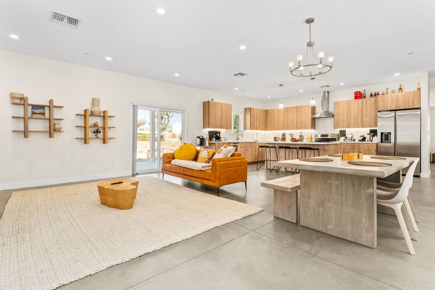 *****Please Note: Starting June 2025, will we be revamping our backyard, our crew will be working within business hours during the day, and some weekends. We are still taking bookings, but wanted to share this with our future guest***** LOCAL ATTRACTIONS: 10 mins ➔ Joshua Tree Village 10 mins ➔ La Copine 10 mins ➔ Integratron 10 mins ➔ Joshua Tree National Park 15 mins ➔ Pappy & Harriet's 15 mins ➔ Pioneertown 45 mins ➔ Palm Springs 60 min ➔ Indio Here Are A Few Kind Words From Our Past Guests: “The house was clean; had all the amenities, supplies, games as described;,great location, 1 minute drive to walmart, safe neighborhood; non-intrusive - no one coming in your way. There were a couple of issues - 2nd bathroom drain plug was stuck - it would not drain, we were not able to turn light and fan on with the remote, Sarah was available to communicate and troubleshoot.” “super clean and all the kitchen amenities. super cool stay super close to the park and minutes away from grocery stores” “My stay at the Mojave Breeze was nothing short of amazing! From the stunning desert views to the cozy, stylish interior, every detail was thoughtfully designed. The home was spotless and incredibly comfortable and had everything we needed—a fully stocked kitchen, super-fast Wi-Fi, and even a record player! The outdoor space was the real highlight—watching the starry desert sky was magical. The location was peaceful and private, yet still close to Joshua Tree National Park and local shops. The host was fantastic—responsive, friendly, and full of great recommendations. I couldn’t have asked for a better experience. 10/10 would stay here again! Highly recommend for anyone looking for a relaxing and stylish desert retreat.” OUR PLACE" A modern vacation home with an open floor plan, perfect for hosting family gatherings and holiday celebrations. KEY FEATURES: ☀ 3 spacious bedrooms; 1 king, 2 queens, 1 air mattress ☀ 2 full bathrooms; ensuite bathroom (primary) & hallway bathroom w/ tub ☀ Large full kitchen with stainless steel appliances ☀ Open living room with comfy seating and boho inspired decor ☀ Open concept dining area ☀ Game Room with pool and ping pong table plus more ☀ Yoga Room ☀ Propane BBQ ☀ Adirondack chairs for stargazing or sun bathing seating ☀ High Speed + Fast Free Wi-Fi ☀ Smart TV ☀ Heat/AC ☀ Keurig & Espresso Coffee Machine ☀ Short drive to Joshua Tree National Park ☀ Close to cool shops and great restaurants ☀ Free Parking for up to 3 Vehicles ☀ EV charger outlet ONLY ☀ Plenty of sleeping space for extra guests * CLOSEST AIRPORTS - Palm Springs, CA (PSP) – 45 mins - Ontario, CA (ONT) – 1 hour 30 mins - Orange County, CA (SNA) – 2 hours - Long Beach, CA (LGB) – 2 hours 15 mins - San Diego, CA (SAN) – 2 hours 30 mins - Los Angeles, CA (LAX) – 2 hours 45 mins
